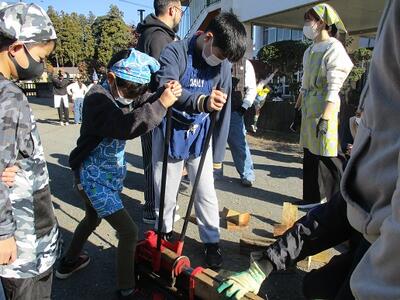 写真①収穫したお米で餅つきに挑戦する5年生。 ②③「よいしょ!」「いちのたに!」大きなかけ声とともに餅をついていきます。④⑤先生たちも「よいしょ!」 ⑥薪を割るのに夢中な子も。 ⑦火をおこして米を炊く子もいます。 ⑧ついたお餅でのし餅を作っていきます。 ⑨最後はみんなでついたお餅をたっぷり味わいました。⑨最後に大成功の記念撮影。「ハイ、いちのたに~!」