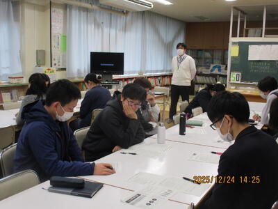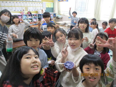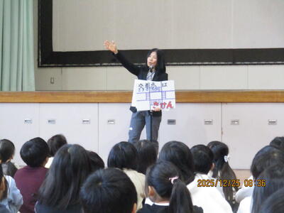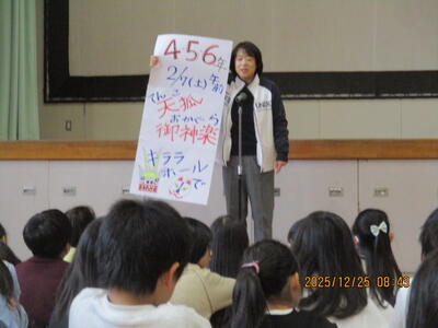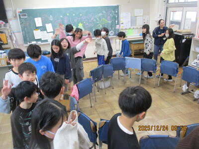 全校朝会では、「今年の目標は達成できたかな!?」と今年を振り返り、新しい年のスタートには大きな目標と小さな目標を立てようと呼びかけました。続いて生活指導担当から冬休みの過ごし方、次に2月の音楽の祭典への案内がありました。各学級では、お楽しみ会など、楽しく過ごしている様子が見られ、サンタさんのように大きな荷物を手に笑顔で下校していきました。「健康・無事故でよい年を迎えられますように!」