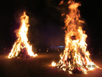 本日、夜が明けるとともに地域の伝統行事である「歳の神」が地域の協力の下、PTA主催で行なわれました。この行事は、子供たちが寒さに負けず、元気に勉強や遊びに頑張ってほしいとの願いから毎年開催されています。