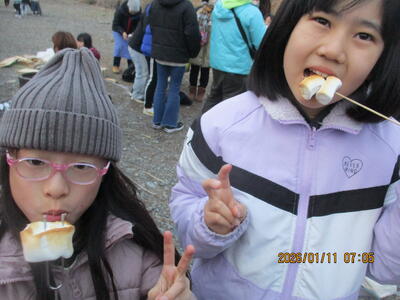 写真①みんなの願いを乗せて天高く登る炎。 ②佐々木PTA会長は、早朝から準備に当たった皆様へ感謝の言葉を伝えました。 ③カウントダウンして6年生が代表となって一斉に点火。 ④普段は見られない大きな炎をに見入る子供たち。 ⑤火が収まるとみんなが楽しみにしていたまゆだま(お餅)を焼きました。 ⑥どうやらお餅だけではないようです。いろいろ焼いて楽しんでいました。 ⑦子供たちは焼きマシュマロが大好き。思わず笑顔のピース。 ⑧温かい飲み物コーナーでも子供たちが活躍。一の谷の子供たちは、こうやって大人から多くを学んで育っていきます。