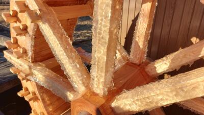 毎朝の寒さで、新しくなった水車も凍ってしまいますが、子どもたちは「きれい!」「すごい芸術的!」と笑顔いっぱいです。(写真⑩⑪)