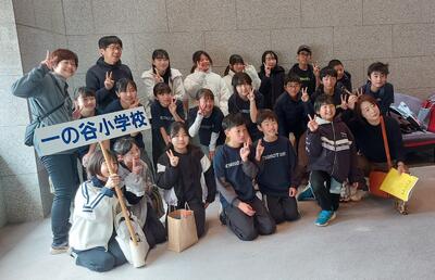 写真①出演直前、いざ出陣! ②先ずは「屋台」天狐(お囃子)登場!大きな舞台で力強く跳ねました! ③続いて、「御神楽」(獅子舞)を披露。力強い舞いと演奏が会場に響きました。 ④最後は全員で舞台に勢揃い。たくさんの拍手をもらいました。 ⑤大成功!でみんなでポーズ「いちのた~に!」