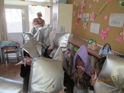 4月15日(水)には、今年度最初の避難訓練を実施しました。一番大切な命を守る勉強として、様々な想定で11回予定しています。今回は第1日目ということで、「おかしも」の確認の他、放送の聞き方、防災頭巾やハンカチ等の使い方など基本について学びました。
